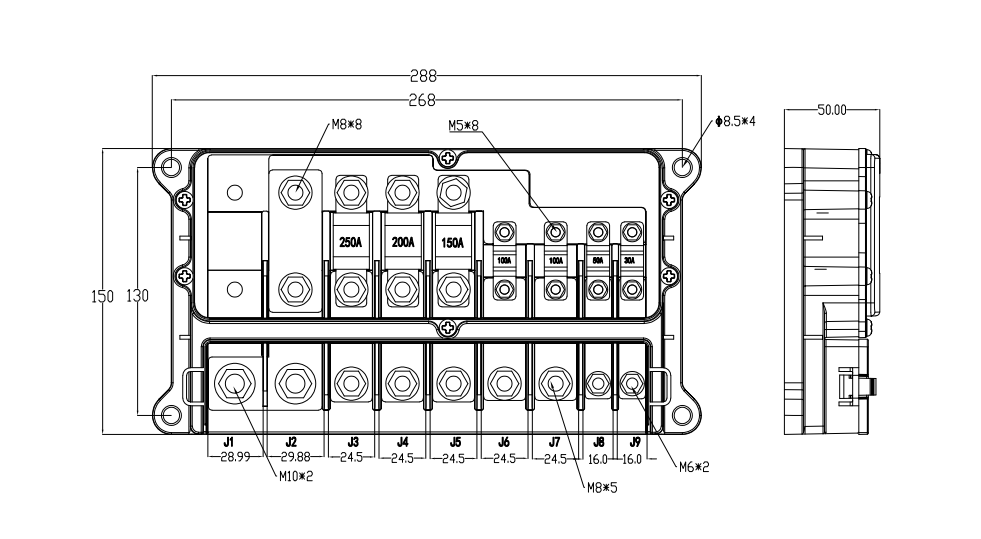 输入端 M10螺柱,输出端 M10、M8、M6螺柱